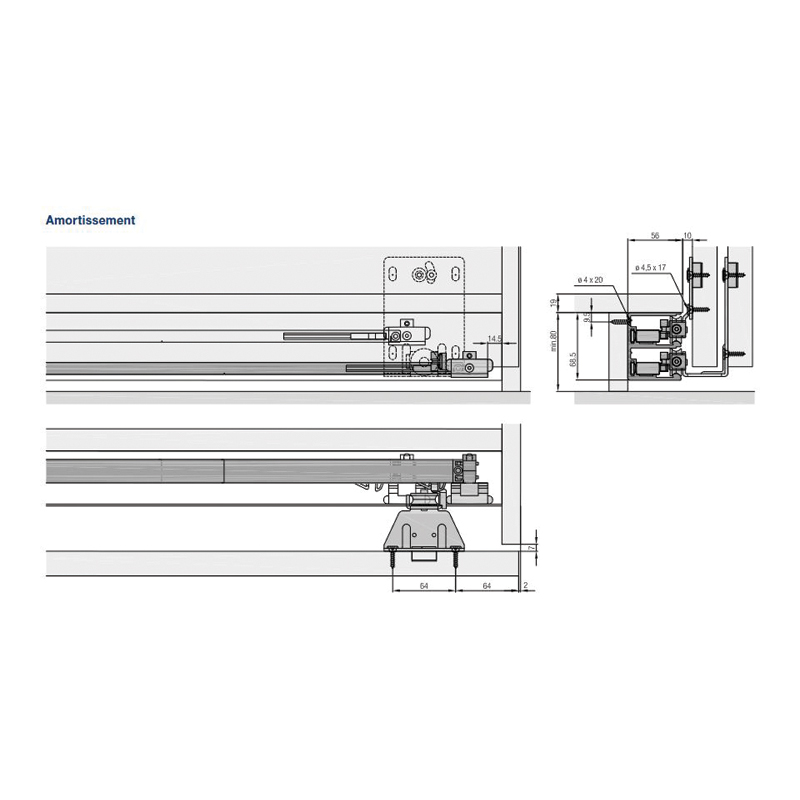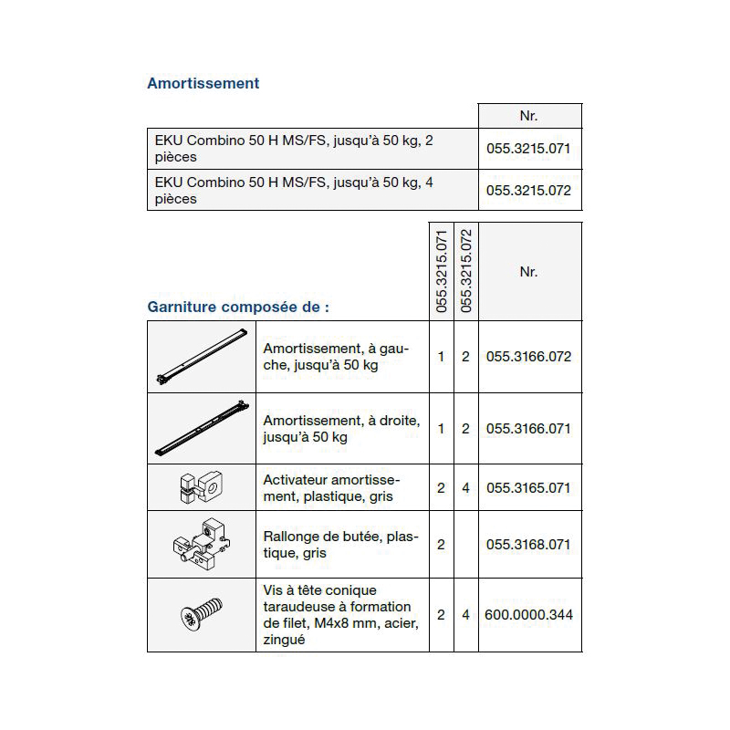 Amortisseur pour Combino 50H FS jusqu'à 50 kg. Garniture de 2 pièces composée de : 1 amortisseur à gauche. 1 amortisseur à droite. 2 activateurs. 2 rallonges de butée. 2 vis lentiforme autotaraudeuse Garniture de 4 pièces [...]