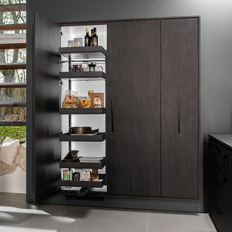 Indépandant de la hauteur du caisson, grâce au montage sur le côté du meuble. A l'ouverture de la porte, la ferrure sort automatiquement. Etagères réglables en hauteur.