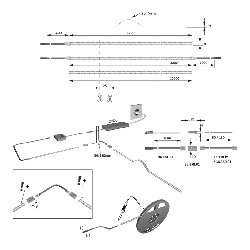 Câble longueur 1800mm aux deux extrémités pour les bandes de 3000mm.