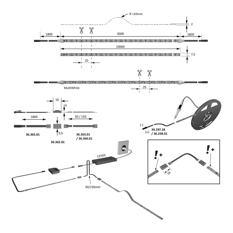Câble longueur 1800mm aux deux extrémités pour les bandes de 3000mm.Bande LED 10000mm non câblée.