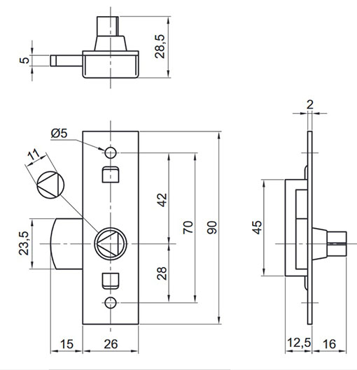 Fouillot triangulaire de 11 mm.Came et fouillot en bronze d'aluminium.Fonctionnement : rotation 1/4 tour.Coupe-feu.