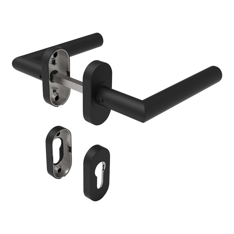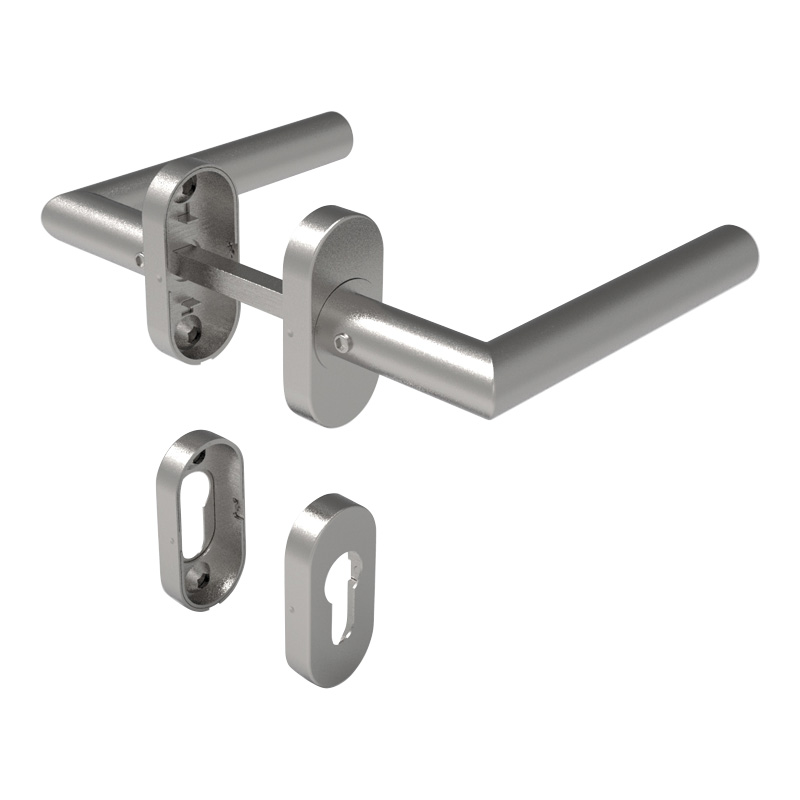Béquille double sur rosaces ovales clé i, pour montage sur le profil 66 de la porte battante.Livré avec carré de 7 x 120mm + adaptateurs 8mm.