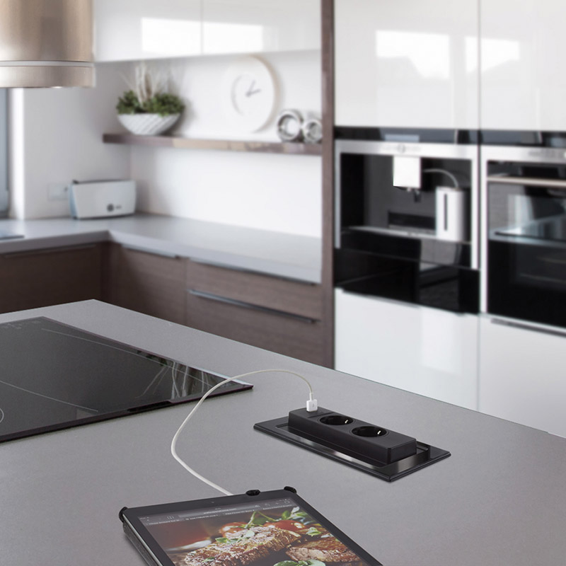 Bloc prises rotatif. 2 prises secteur, protection contre les contacts. 1 prise chargeur USB. Câble de raccordement 2500mm