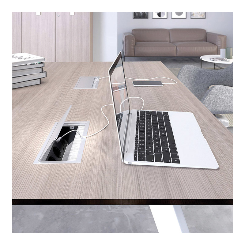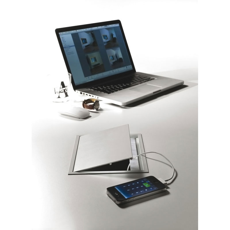 Armature aluminium décor anodisé argent.Borne interne noire.Capot relevable avec fermeture amortie.Passe câble avec brosse d’étanchéité.Fixation par serrage sous plateau épaisseur maxi 30mm.Livré avec câble longueur 2000 mm.