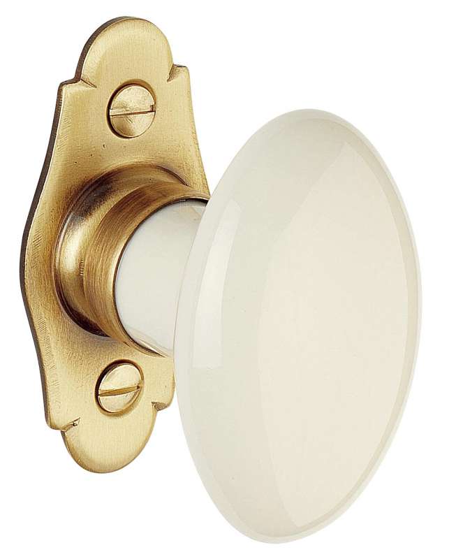 Bouton simple porcelaine sur platine laiton patinée.Livré avec carré de 7mm et vis laiton.