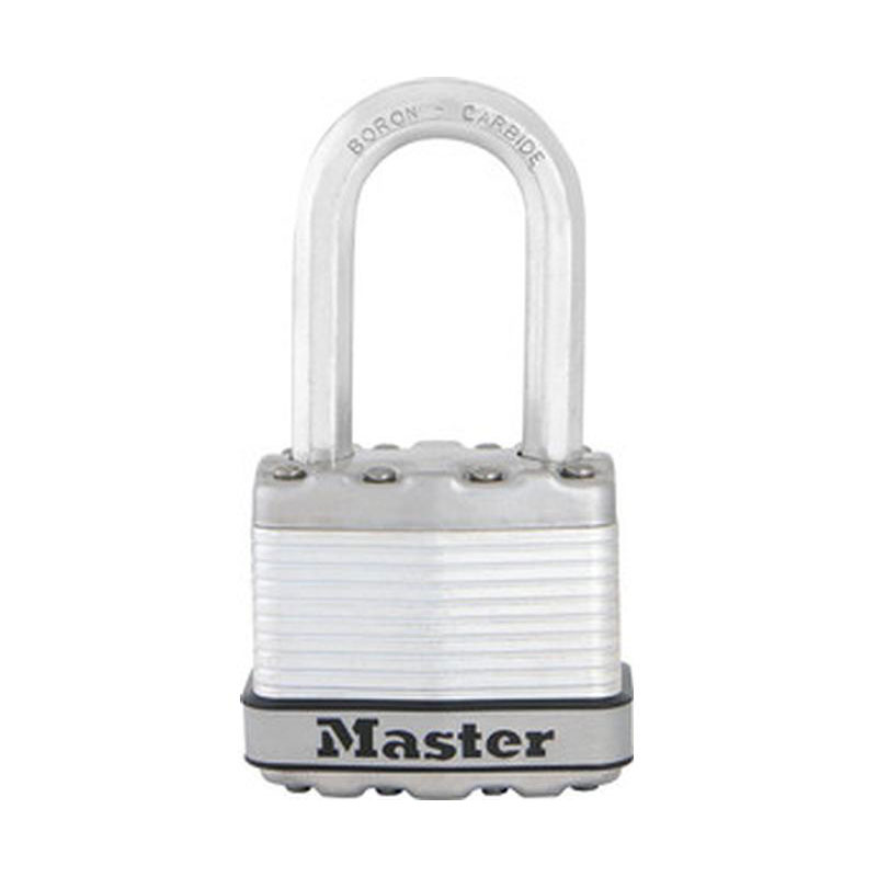 Le cadenas Excell® Master Lock nº M1EURDLF présente un corps en acier laminé pour une résistance et une fiabilité maximales. Le corps est entouré par des composants en acier inoxydable et en zinc pour une meilleure résistance aux intempéries. L'anse octogonale se compose d'alliage de bore traité au carbure de tungstène Tough-Cut™, 50 % plus résistant que l'acier cémenté, offrant une résistance maximale à la coupe et au sciage. Le cylindre à 4 goupilles offre plus de résistance au crochetage et le double verrouillage à billes offre une résistance maximale contre l'effet de levier et le martelage.