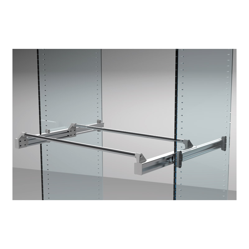 Cadre coulissant extensible pouvant recevoir des corbeilles et cintres (non fournis).Fixations latérales sur coulisses aluminium à sortie partielle : sortie 310 mm.Bras et fixations sont en nylon renforcé par fibre de verre, décor gris alu.Tubes transversaux extensibles en acier chromé.