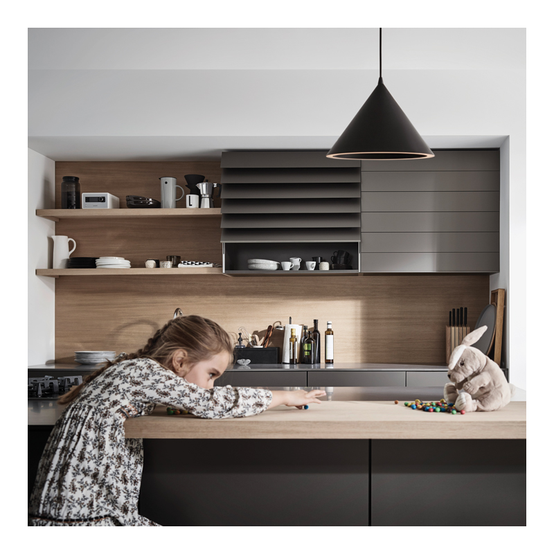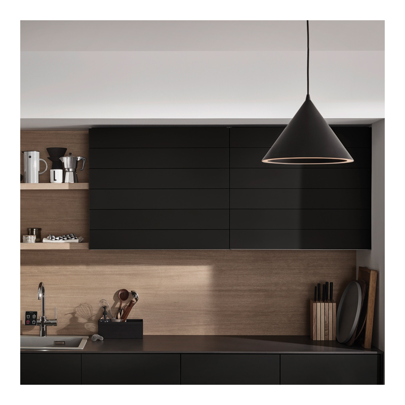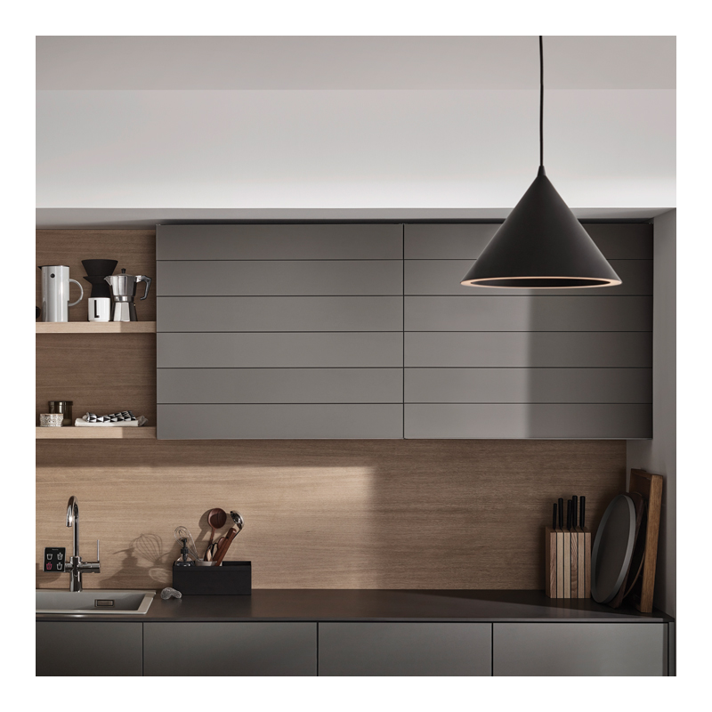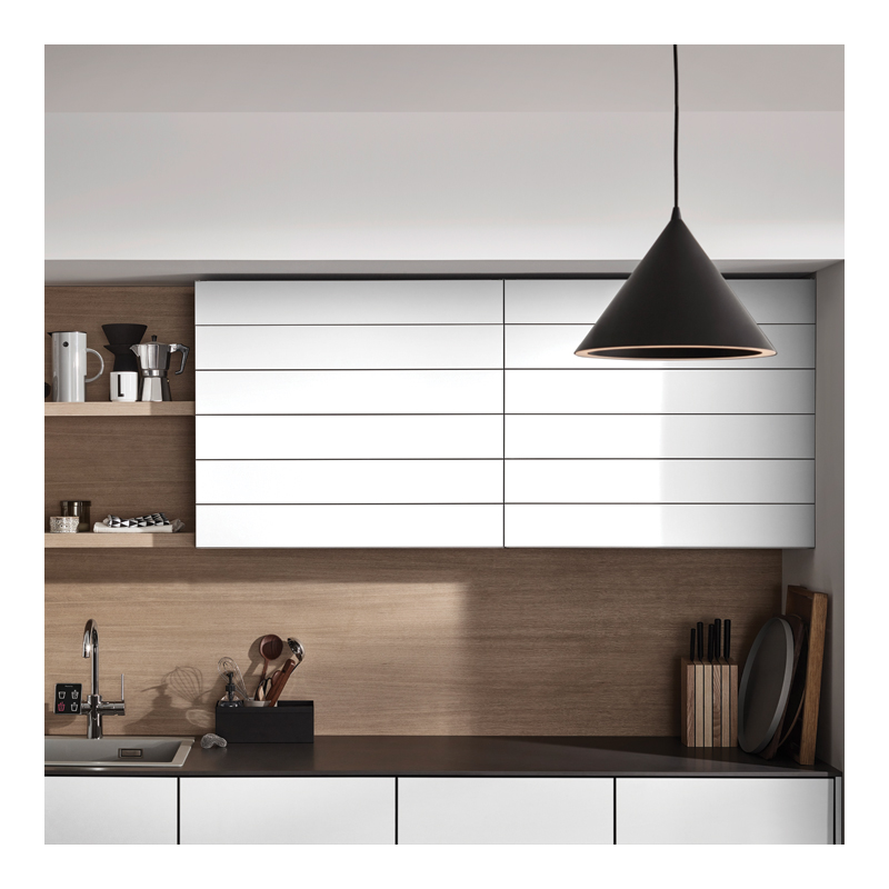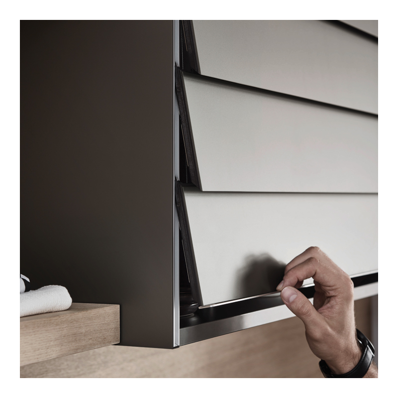 Design sans cadre comprenant un système de guidage intégré invisible et un mécanisme à ciseaux.Arêtes extérieures des lames avec biseau pour une réflexion optimale de la lumière et un très bel aspect.Lame terminale intégrée en aluminium.