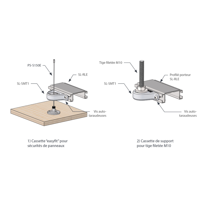 Le SL-SMT1 est une cassette composée de Grilon AS V0 (feu retardant), facilement positionnable sur les profilés SL-RLE (réf. 024 28000 30060), qui a 2 fonctions :1) Cassette "easyfit" pour installer les sécurités de panneaux PS-150E (réf. 024 81500 00100) et PS-S150E (réf. 024 81500 00200).Le SL-SMT1 a alors une capacité de charge au choc de 25Kg/f.2) Cassette de support pour tige filetée M10 afin de suspendre la structure SL-RLE au plafond. Le SL-SMT1 a alors une capacité de charge statique de 50Kg/f.