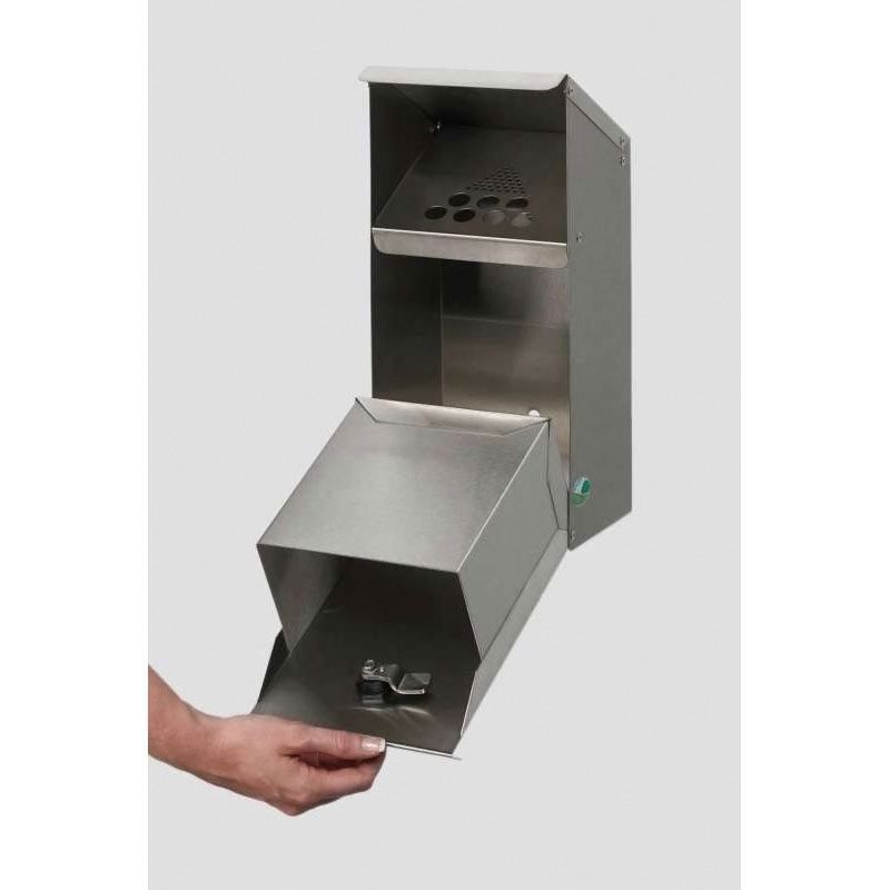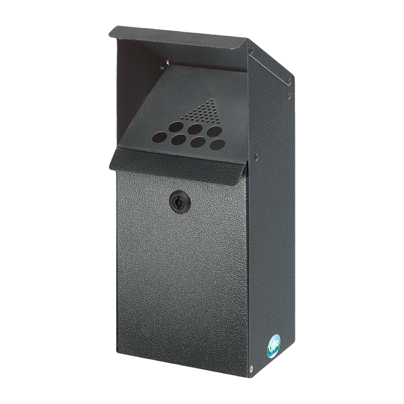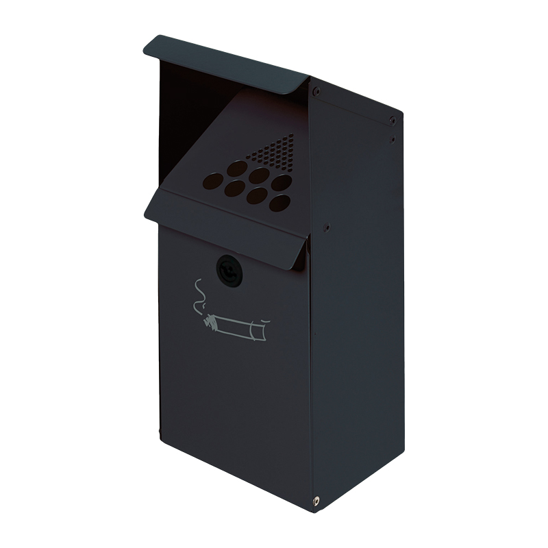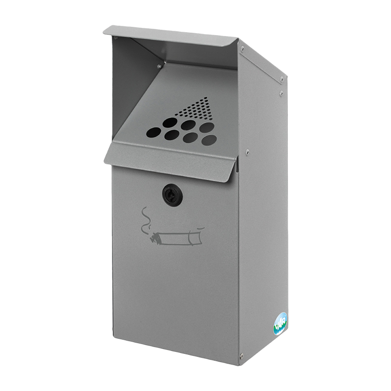 Cendrier murale en tôle d'acier galvanisé avec revêtement par poudre époxy Anti-UV.Cendrier avec toît de protection contre les intempéries.Contenant d'un volume d'environ 3,7 litres, et a fermeture sécurisée par une clé.