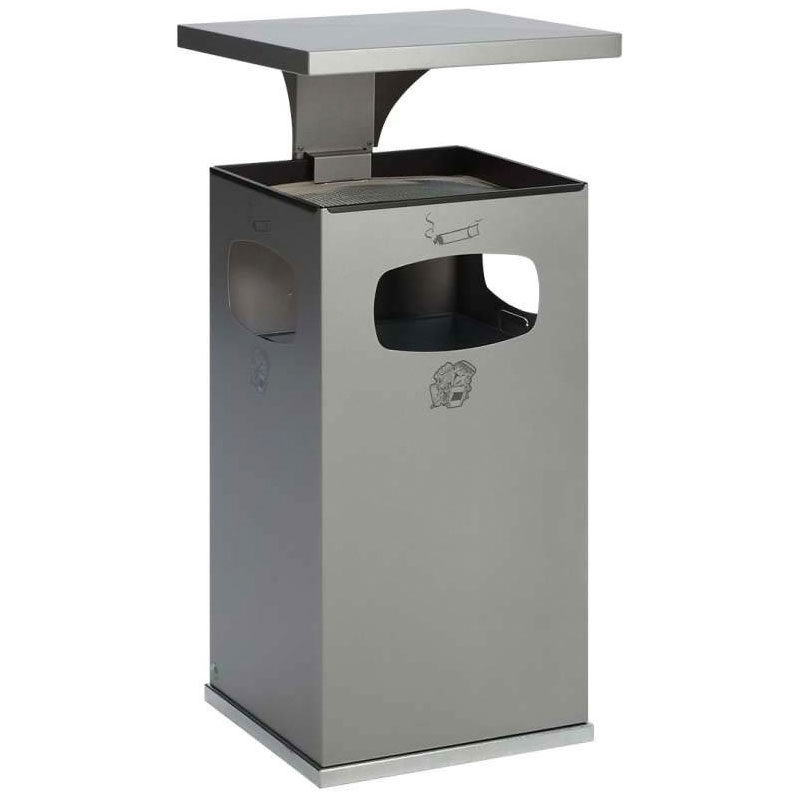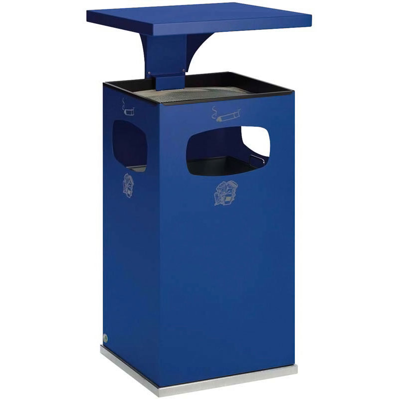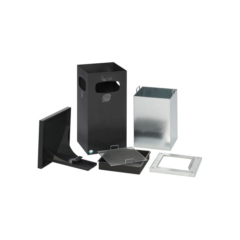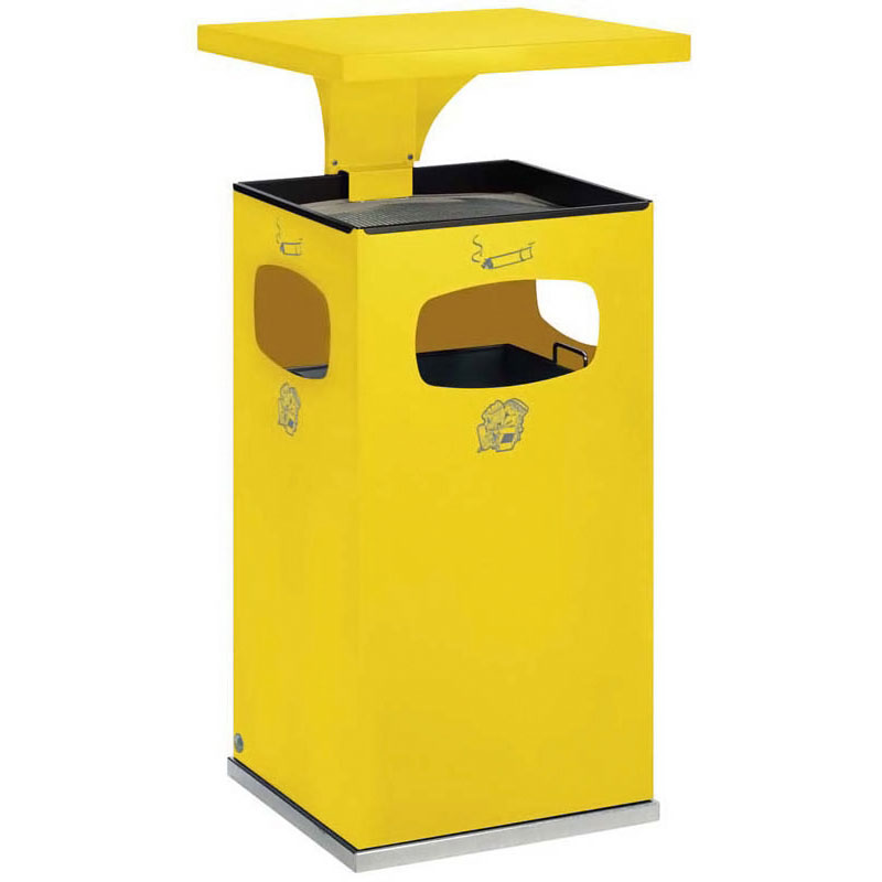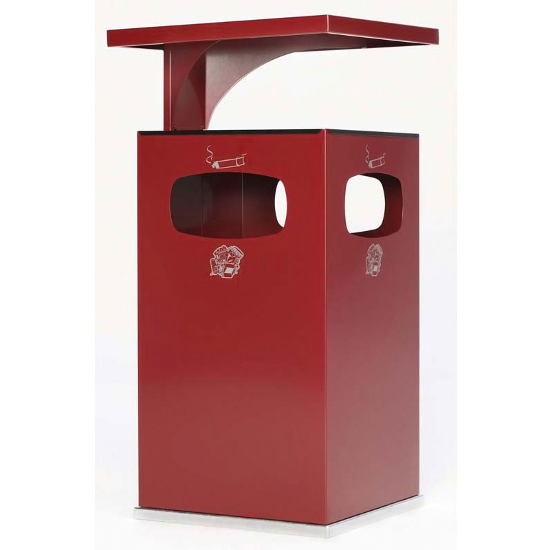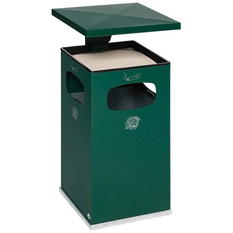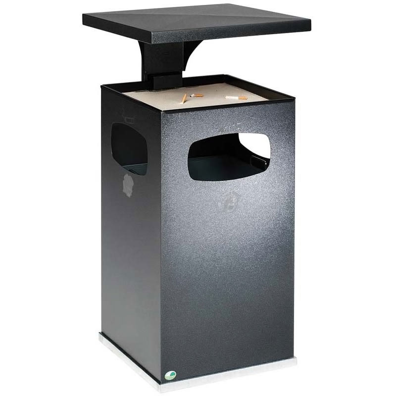 Cendrier poubelle avec toit renforcé pour usage extérieur.En tôle d’acier galvanisé recouvert d’époxy cuite au four avec traitement Anti-UV et Anti-Urine.Excellente résistance à la corrosion. Le chapeau démontable est verrouillable par serrure à clé carrée, ainsi la coupelle pour sable et tamis sont protégés.Seau intérieur amovible avec poignées en acier galvanisé.Possibilité de fixation au sol.