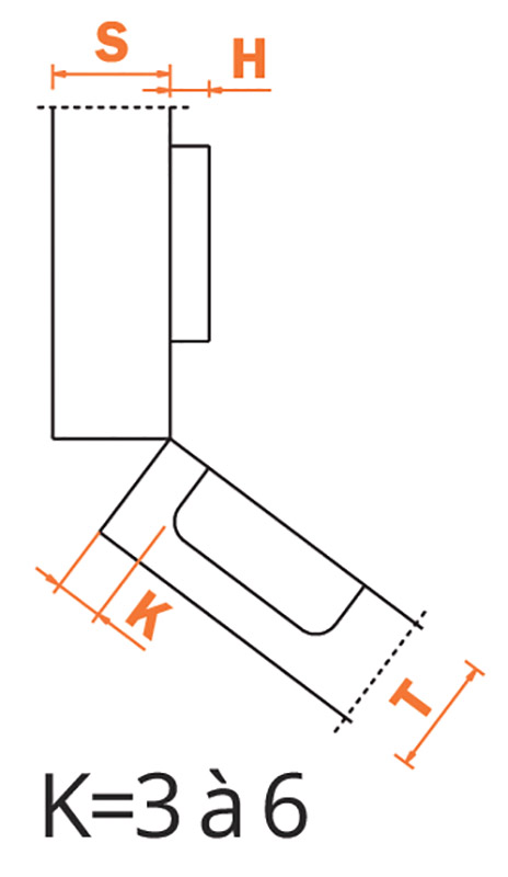 S = Épaisseur du côtéD = Recouvrement désiréT = Épaisseur maximale de la porteK = Distance de perçageA = JeuL = Distance entre la porte et le côtéH = Épaisseur de l'embase