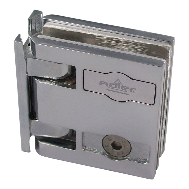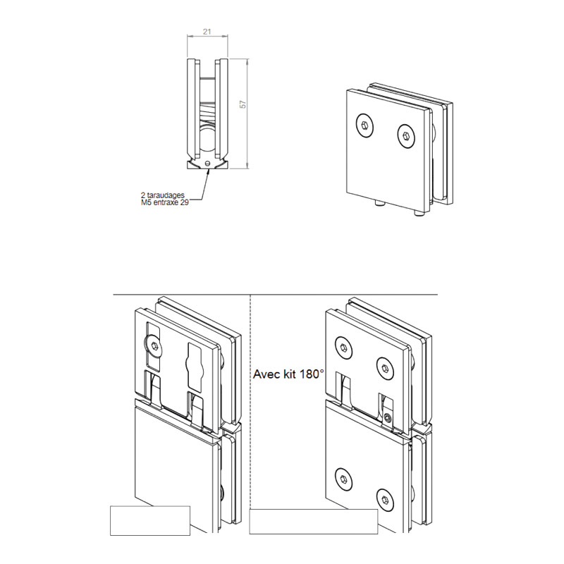 Charnière CAPSI glace/glace 180°, à rappel et angle réglable en continu sur +/- 90°.Composée d'une charnière CAPSI mur/glace sans platine et d'une pince glace à contreplaque CAPSI de largeur 55 x hauteur 57mm.Montage avec encoche dans le verre.Livrée avec caches-vis et cales aluminium pour verre de 8mm.Jeu de 2 charnières.