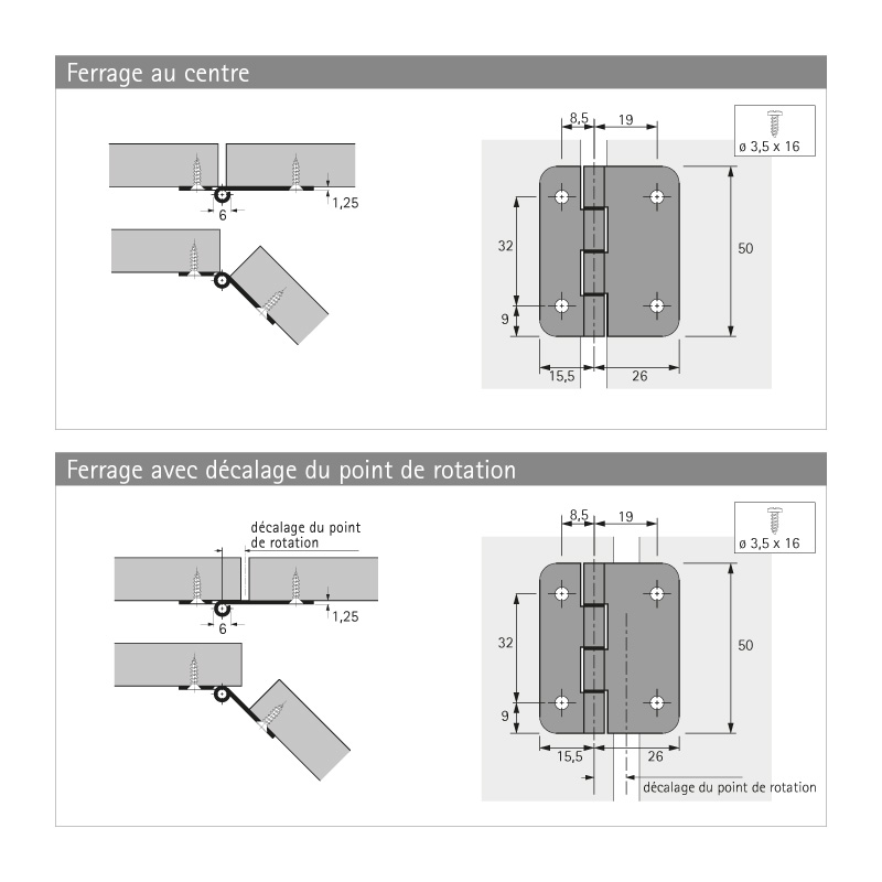 Charnière centrale pour portes pliantes. Axe décentré.Montage possible au centre ou avec décalage du point de rotation.Avec tige d'acier fixe.Bonnes qualités antifriction grâce à des bagues intermédiaires résistantes à l'abrasion.