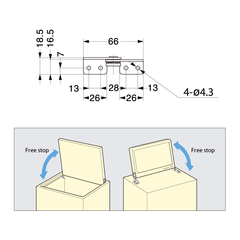 Charnière inox pour petite porte relevable ou pour abattant.Le vantail reste dans la position désirée.Pose en applique.Fixation sur plat.