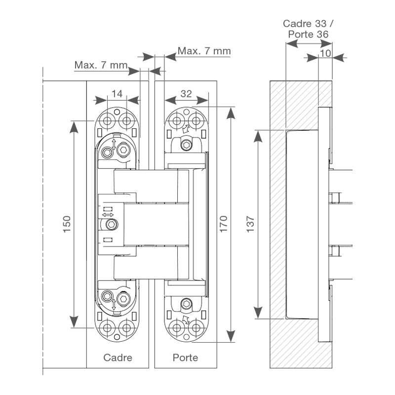 Charnière haut de gamme.Universelle : pour portes gauches ou droites.Easy hook : montage et réglable en 3D (hauteur, largeur, profondeur) sans enlever la porte, par une personne.Réglage en hauteur simplifié : pas besoin de cales.Angle d'ouverture de 180°.Profondeur d'encastrement 33mm (cadre) / 36mm (porte).Durabilité : cycle de tests d'ouverture et fermeture min. 200 000.Entièrement soutenue de bagues en matière POM.