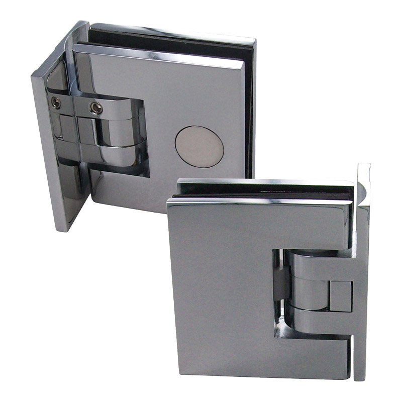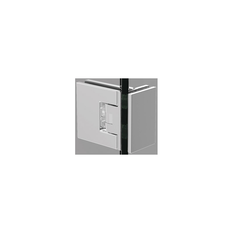 Charnière MINIMA glace/glace 90°, à angle réglable et rappel automatique +/- 10°.Composée d'une charnière MINIMA mur/glace à demi-platine et d'un kit d'adaptation glace/glace 90° MINIMA.Montage avec encoche dans le verre.Livrée avec caches-vis et cales épaisseur 2mm pour verre de 8mm.Jeu de 2 charnières.