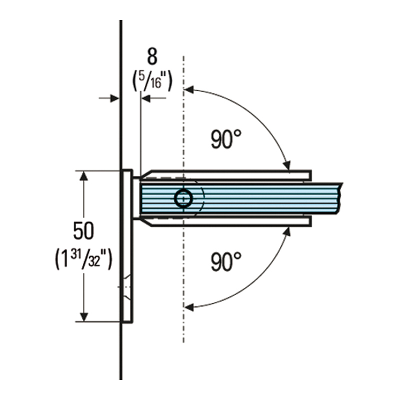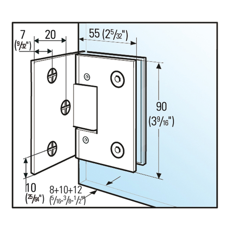 Charnière pour pare-douche verre/mur 90°, pour montage mural unilatéral.Fermeture automatique à partir d'un angle d'ouverture de +/- 15°. En dehors de cette zone la charnière reste dans sa position.Réglage du point 0 en continu, facilitant la tâche de l'installateur.Pour vantail hauteur 2000mm et largeur 1000mm maxi.Livré avec cales, sans matériel de fixation.Hauteur 90mm x largeur 55mm, platine largeur 50mm.