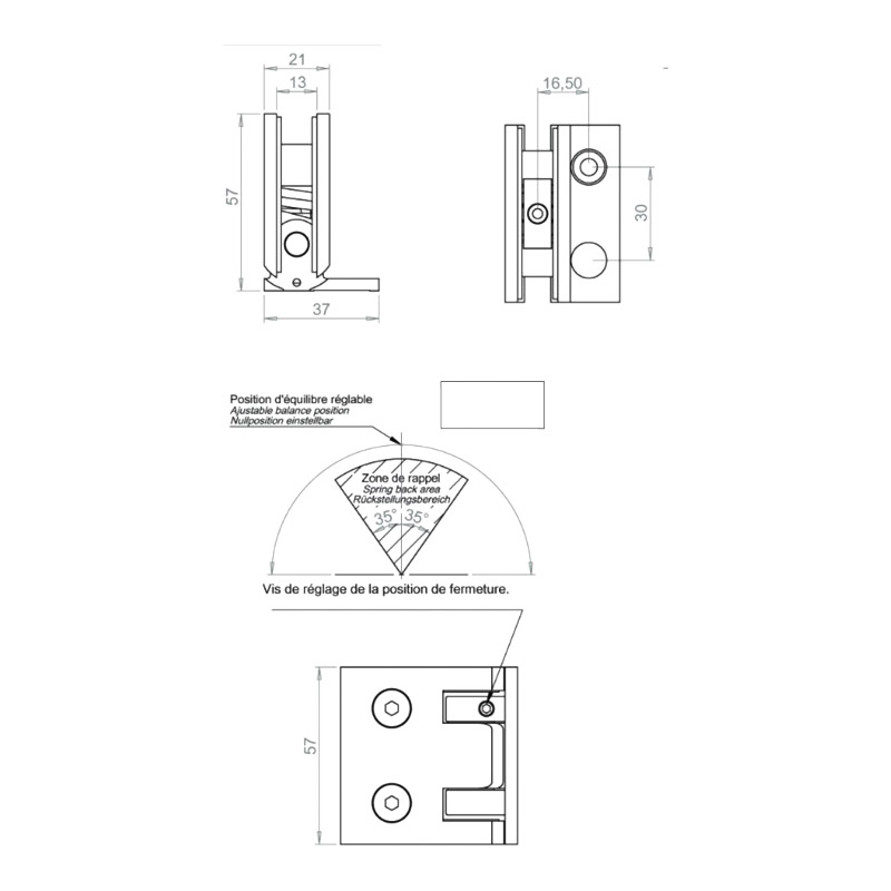 Charnière à rappel REVERSI PRESTIGE mur/glace, à demi platine murale.Position de rappel réglable en continu sur +/- 90°.Plage de fermeture automatique de +/- 30°.Fabriquée en bronze d'aluminium (alliage 2,5 fois plus résistant que du laiton ou de l'inox).Livrée avec jeux de cales plastique PET découpées pour verre de 8 et 10mm (en liège pour verre de 6mm).Montage avec encoche dans le verre.Jeu de 2 charnières.