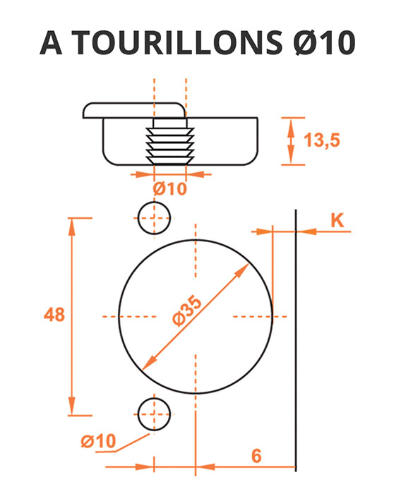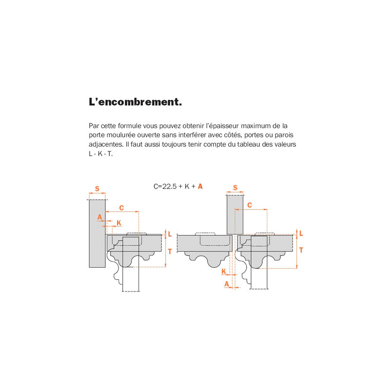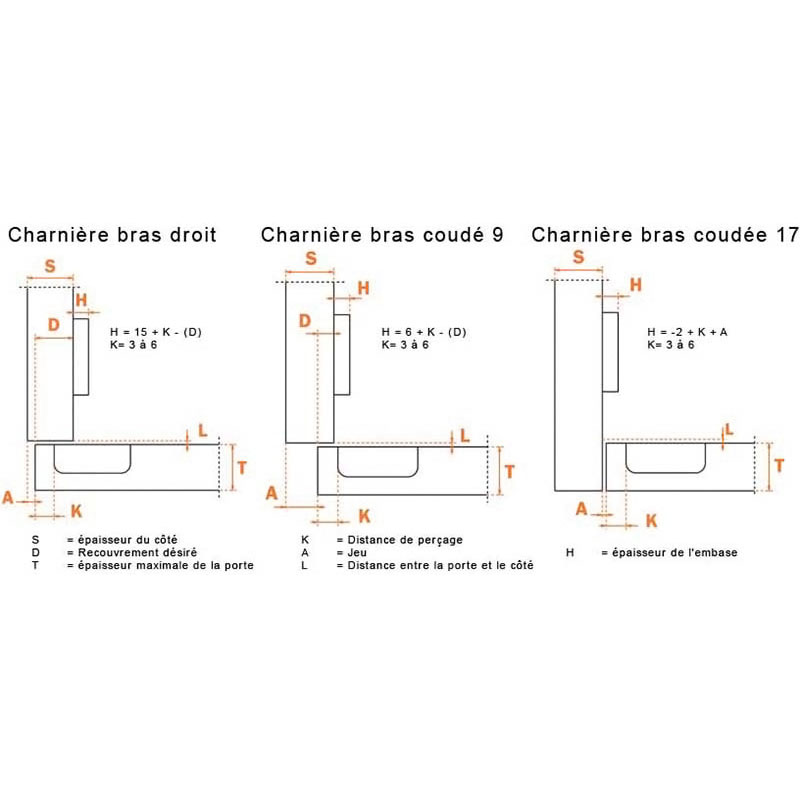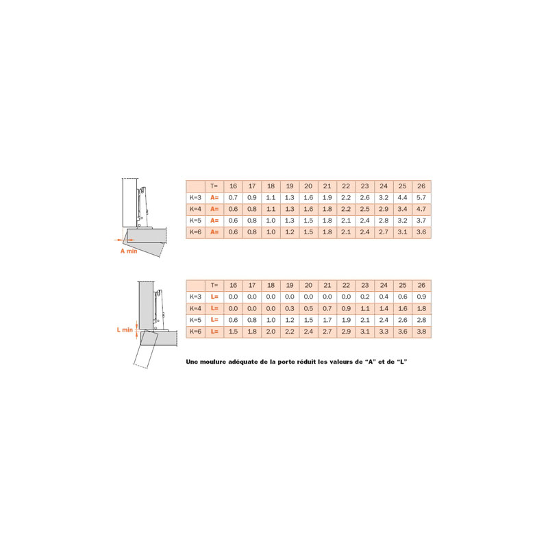 S = Épaisseur du côtéD = Recouvrement désiréT = Épaisseur maximale de la porteK = Distance de perçageA = JeuL = Distance entre la porte et le côtéH = Épaisseur de l'embase