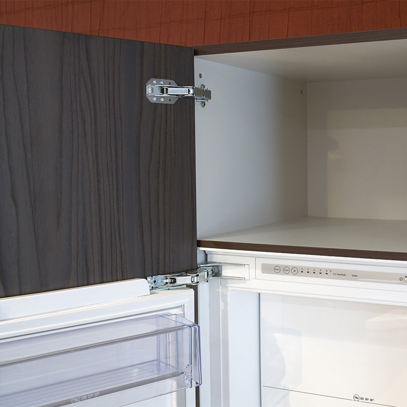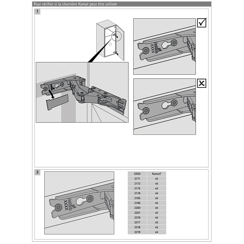 Charnière spéciale Kamat pour aménagements de meubles de réfrigérateur.Charnière de guidage sans ressort. Elle guide le prolongement (la partie haute) de la porte de réfrigérateur.Compatible uniquement avec les réfrigérateurs équipés de charnière type K de marque Hettich.Kit composé de :