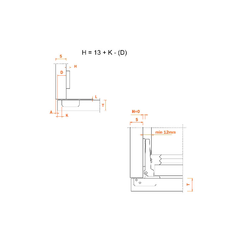 S = Épaisseur du côtéD = Recouvrement désiréT = Épaisseur maximale de la porteK = Distance de perçageA = JeuL = Distance entre la porte et le côtéH = Épaisseur de l'embase