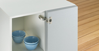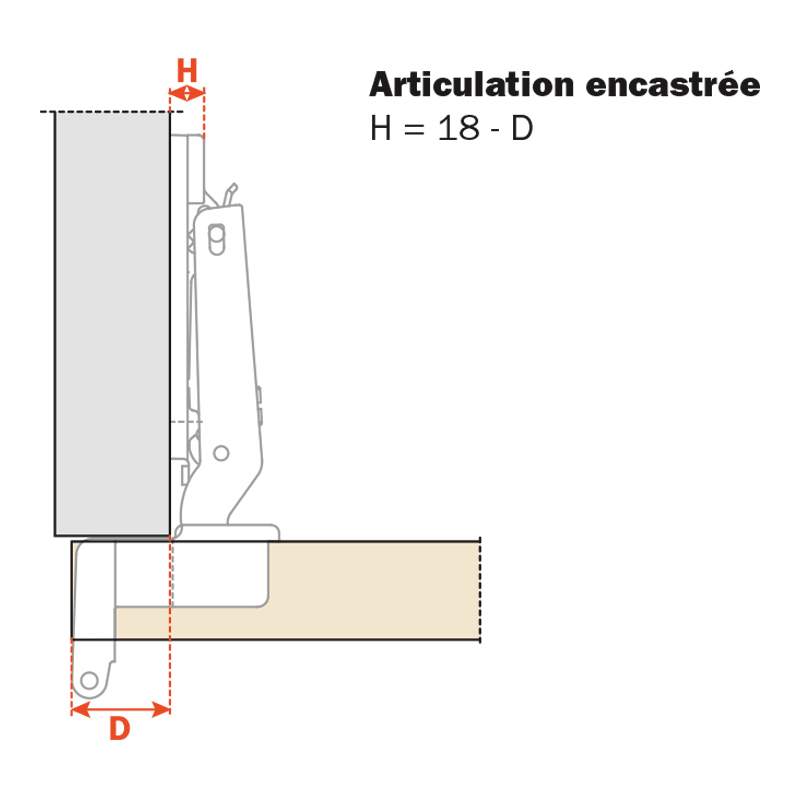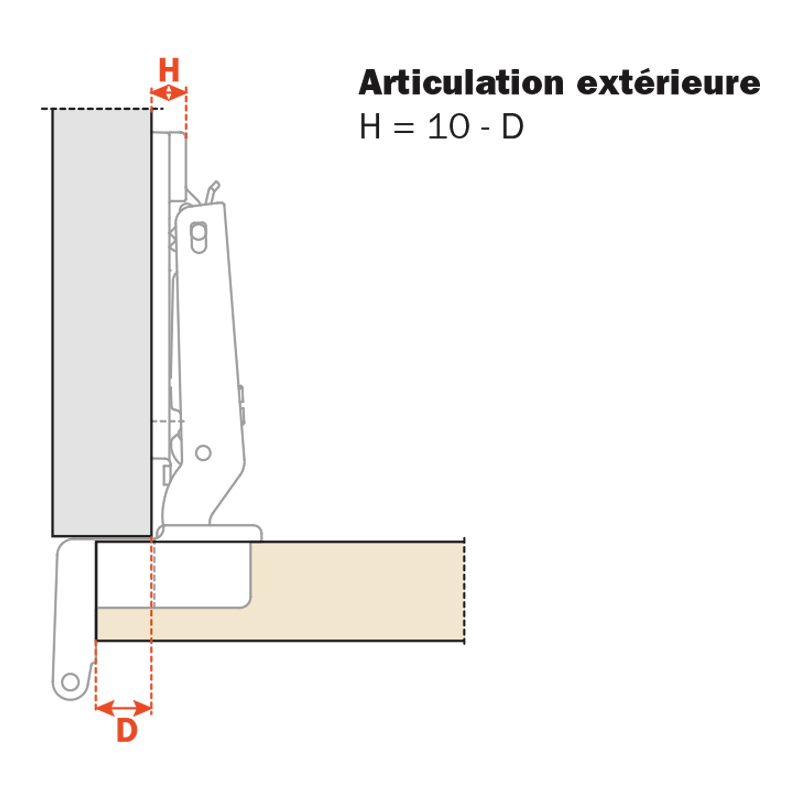 Pour porte intérieureArticulation intérieure. Prévoir une embase épaisseur équivalente à l'épaisseur du côté de meuble.