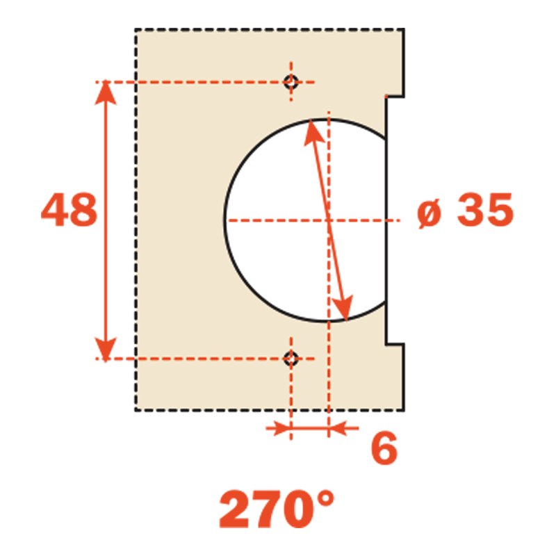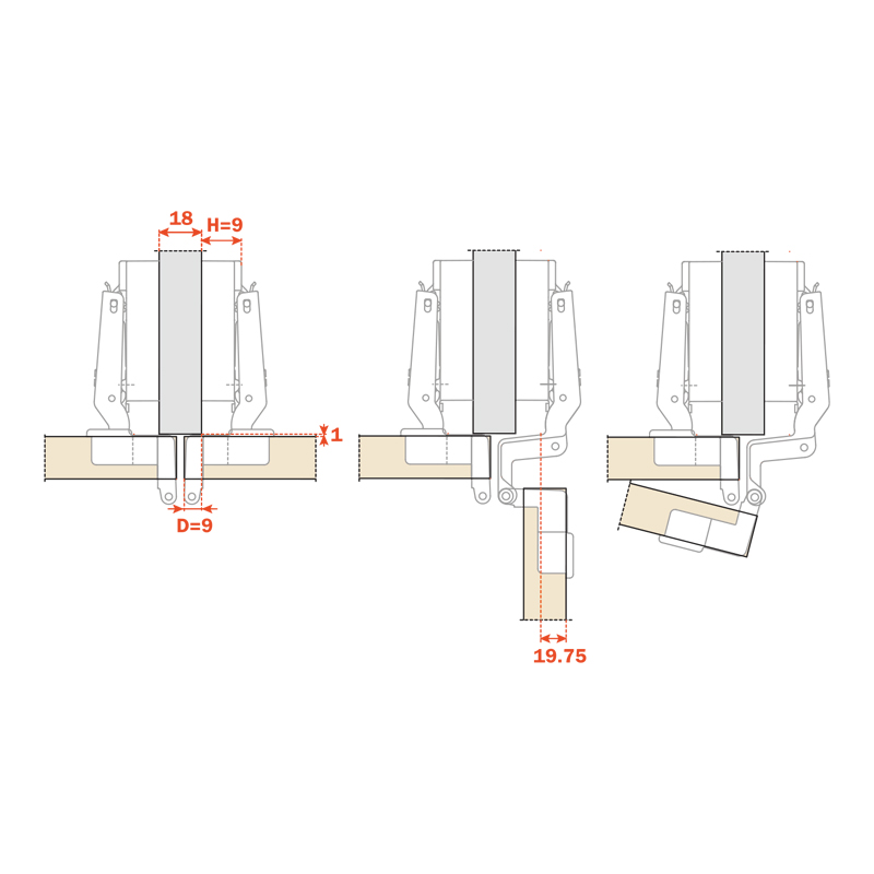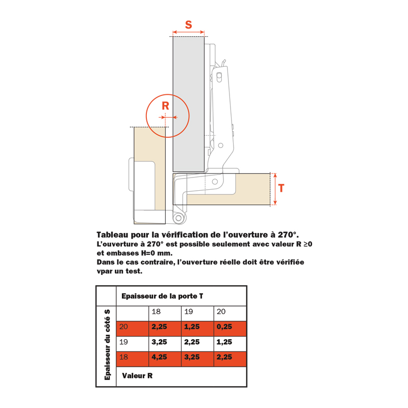 Pour panneau de 19 mm.Pour porte et montant épaisseur 18 à 20 mm.Ouverture 270° avec porte épaisseur maxi 20 mm.Ouverture 180° avec porte épaisseur maxi 24 mm.Nœud apparent épaisseur 8 mm.