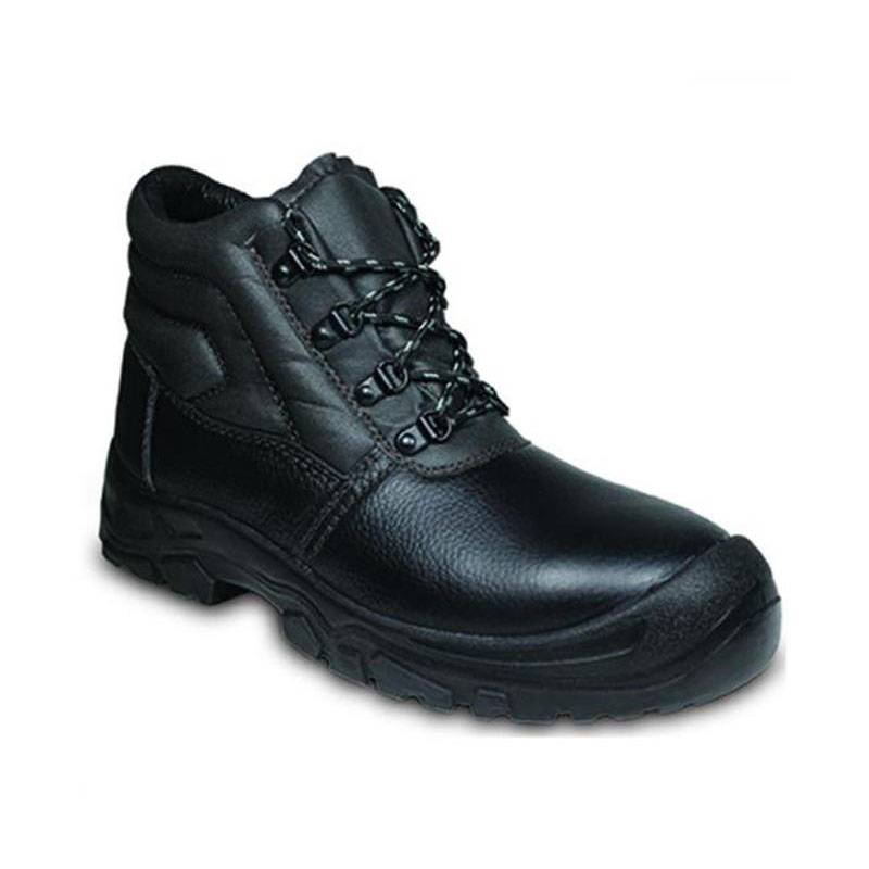 Tige cuir fleur de vachette imperméable noir. > Semelle PU double densité et ACIER. > Doublure non tissée. > Soufflet cuir fleur de vachette rembourré. > Col PU noir rembourré. > Renfort devant ACIER.