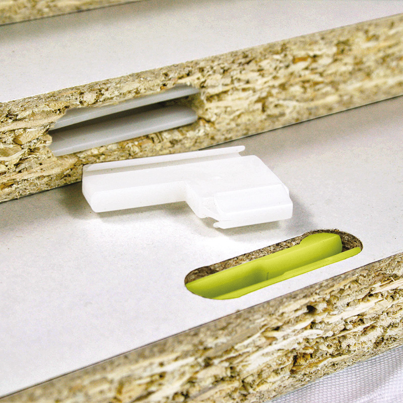 Assemblage pour panneaux. Invisible après assemblage.Les clips peuvent être montés dans des matériaux tels que le bois massif, le MDF, l'aggloméré, le plexiglas ou encore le HPL et est tout aussi résistant si l'assemblage est à plat, perpendiculaire ou sous n'importe quel angle.Pose sur chant, sur plat et sous n’importe quel angle.Grande résistance jusqu’à 125kg(suivant matériau). Assemblage permanent ou démontable.Usinage de l’entaille simple, rapide et facilement réalisable avec outillage électroportatif, fixe ou par centre d’usinage CNC utilisant une fraise Ovvo.Pose sans outil, ni vis, ni colle.Assemblage ou démontage sans outil.