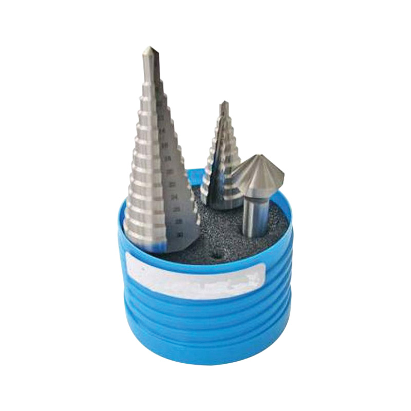 Coffret de 2 forets à étages + 1 fraise à ébavurer en tôle. Composition :- 1 foret d.4 à 20 mm par 2 mm- 1 foret d.6 à 30 mm par 2 mm- 1 fraise à ébavurer d.3 dents 90° diamètre 20,5 mm