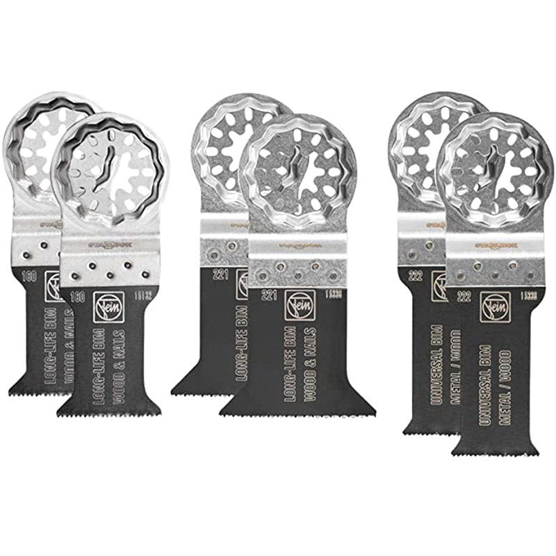 Coffret de 6 lames de scie E-Cut différentes avec denture bimétal. Avec porte-outil Starlock, adapté à toutes les machines oscillantes courantes sur le marché. Également compatible avec Bosch, Makita, Metabo, Ridgid, Skil, etc.