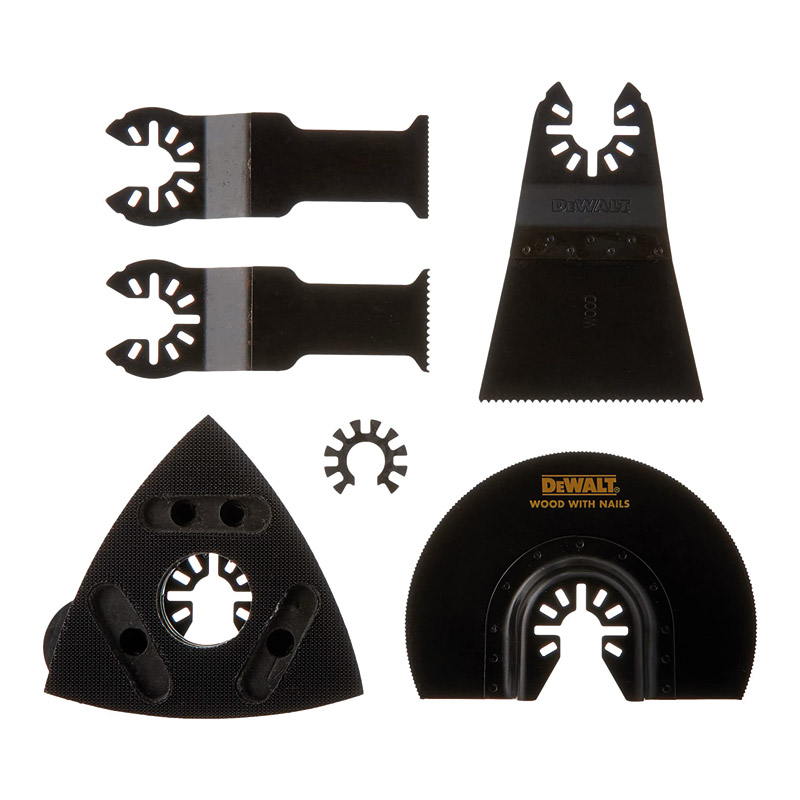 Coffret multicutter de 4 lames, 1 plateau de ponçage, 3 abrasifs, 1 adaptateur.Ensemble contenant les outils appropriés à la découpe de bois + clous.