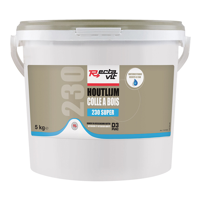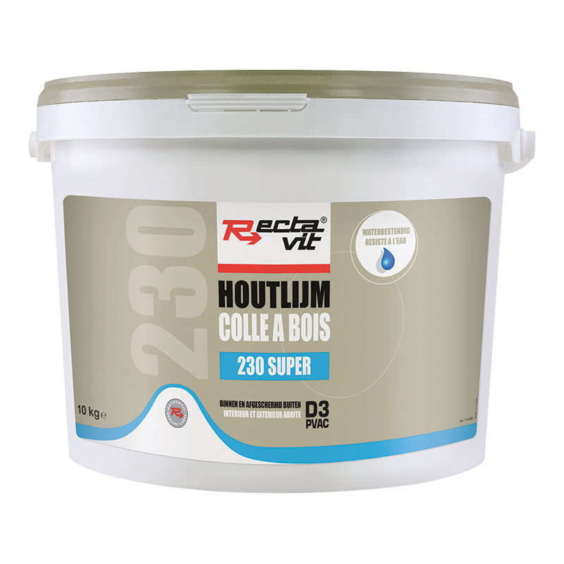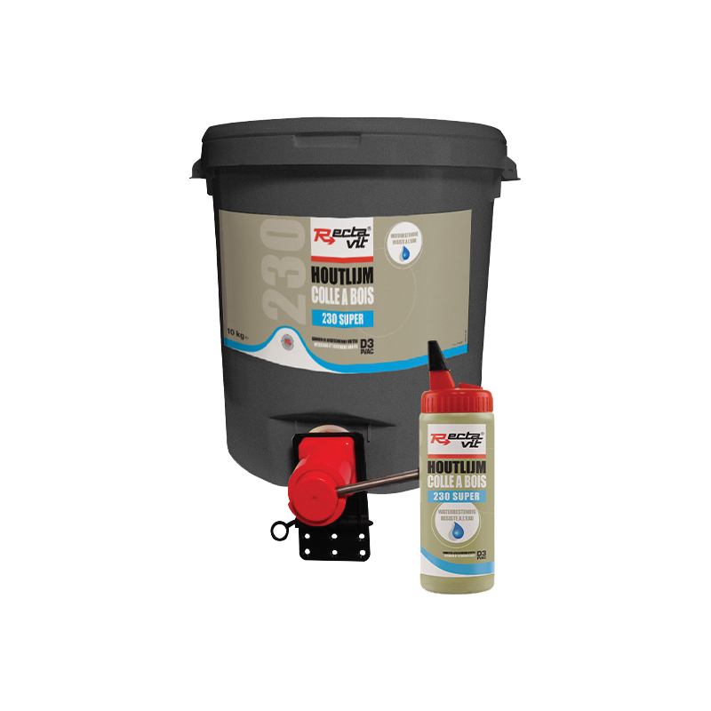 Application :Rectavit 230 Super peut être appliquée avec une spatule finement dentelée (A4), brosse, rouleau, enduiseur de colle, distributeur pour colle blanche ou encolleuse, sur une des surfaces à encoller.Pour arriver à une haute force de traction finale, la colle peut être appliquée sur les deux faces.Pour les bois poreux et les bois durs, l’encollage des deux faces est toujours préconisé.Les surfaces à encoller doivent être jointes dans le temps d’assemblage ouvert de 8 min.L’encollage doit être pressé ou serré durant le temps de durcissement (min. pression de 1 kg/m² pendant un temps min. de 30 min).