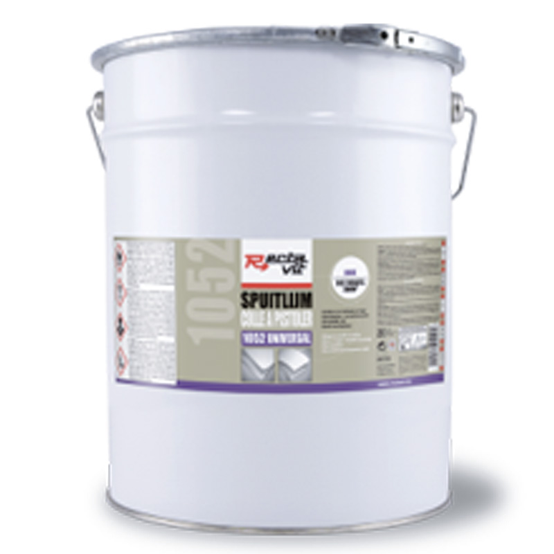 Application :Le Rectavit 1052 est pistolable avec les systèmes de pulvérisation traditionnels ou au pistolet pneumatique.Buse : 2,5 mm ou plus.Pression : 3 à 5 bar.Pression sur la cuve : 0,5 à 1 bar, aussi possible avec un pistolet avec cuve supérieure.Remarque : La colle ne se pulvérise pas comme une peinture, mais donne plutôt des gouttes et des filets.- Si l’adhérence doit être immédiate ou si les matériaux à coller sont non poreux :Appliquer la colle en double encollage avec le pistolet. Veiller à ce que la colle soit appliquée uniformément et avec une couverture de min. 80%. Pour les matériaux très poreux (plâtre, béton,...), appliquer une deuxième couche après séchage de la première, après ± 20 min.Laisser sécher 5 à 10 min, selon les conditions ambiantes, et assembler les deux faces 1 h max. après application.La prise se fait immédiatement. Bien presser avec un maroufleur ou dans une presse pendant 15 s, ou marteler au marteau en caoutchouc dur.- Si on doit pouvoir réajuster l’encollage (min. une surface poreuse), ou l’encollage de deux matériaux poreux :Il suffit de pistoler la colle Rectavit 1052 sur une des pièces.Après usage, fermer immédiatement la boîte.