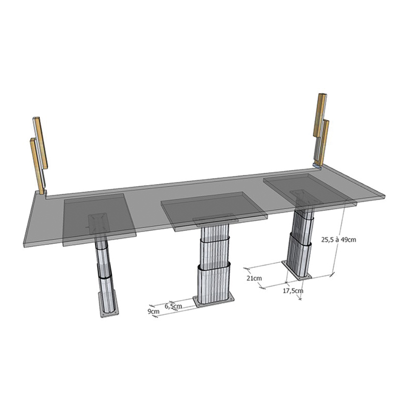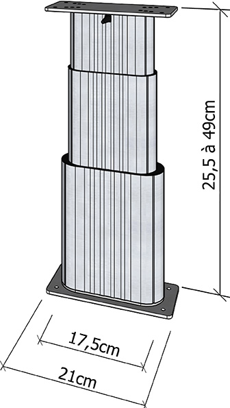 Les colonnes s’installent sous le mobilier et remplacent les pieds en plastique habituels.Course de 235mm. Vitesse de 25mm/s.Charge maximale de 80kg par colonne (mobilier compris). Commande par interrupteur monte/baisse fixé [...]