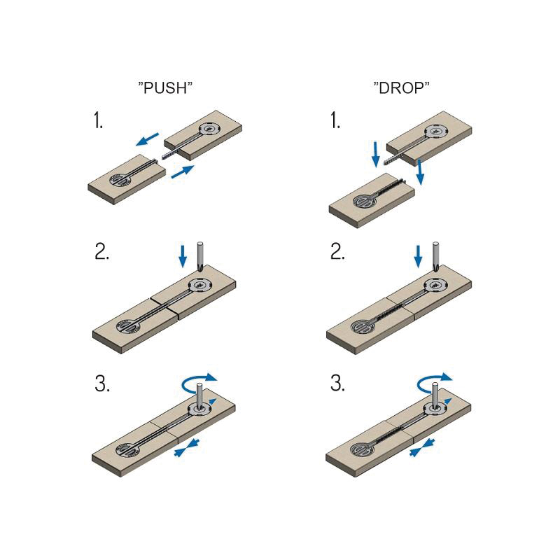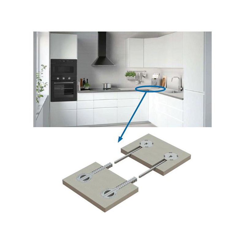 Connecteur d'assemblage de plan de travail ou panneaux de faible épaisseur (10 mm et plus), composé d'une partie mâle et une partie femelle.Après fraisage des trous dans les 2 panneaux, et les deux parties du connecteur insérées dans les panneaux, l'installation peut se faire de deux façons (selon la configuration de la cuisine) : - "push" : la partie mâle vient se glisser dans la partie femelle en resserant les panneaux.- "drop" : la partie mâle s'encastre dans la partie femelle de haut en bas directement à la bonne longueur, les panneaux sont serrés sans glissement.Utiliser ensuite un tournevis PH3 pour tourner l'insert et bloquer le système.