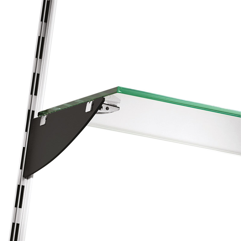 Console en aluminium au pas de 37mm, avec encoches pour pose de cavaliers A1 ou A2 en acier permettant la mise en place d'une tablette.Charge : 50kg par étagère (charge équitablement répartie avec des crémaillères posées avec un entraxe 600mm).
