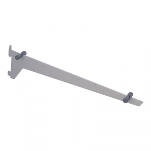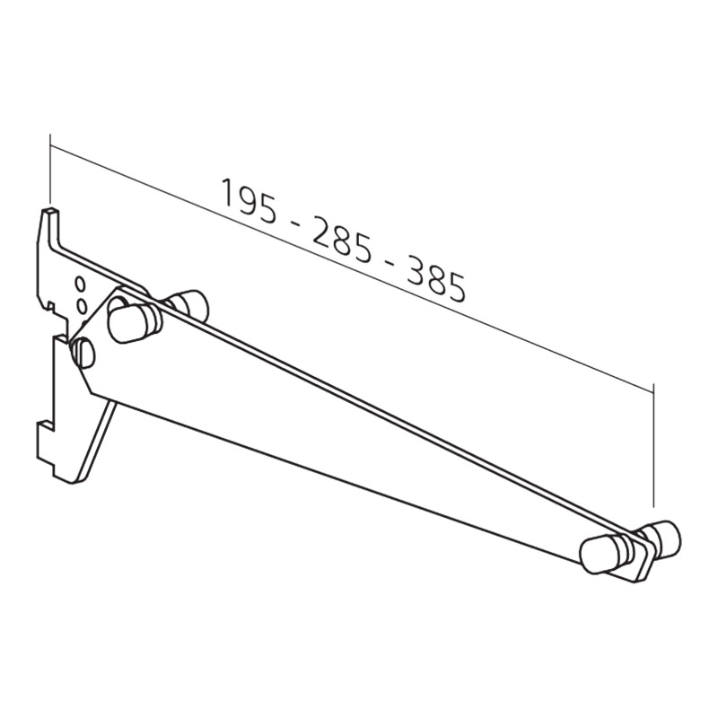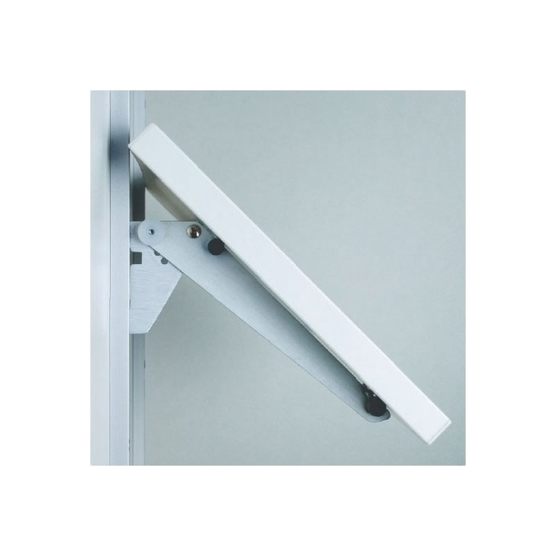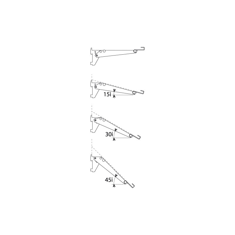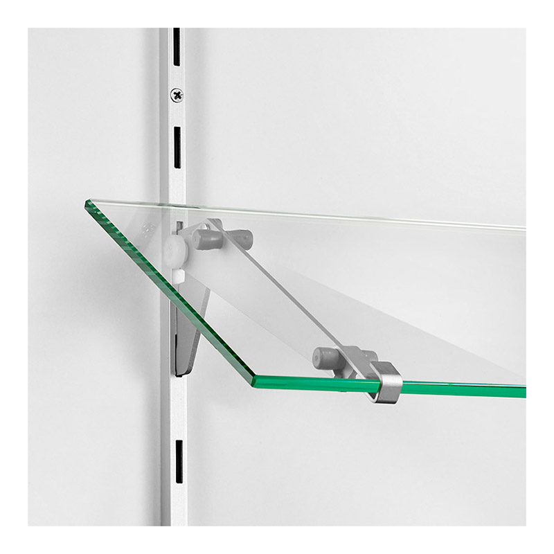 Console en alu inclinable de 0 à 45° pour tablette bois ou verre, équipée de 2 patins caoutchouc antidérapants.Pose sur crémaillère à perforation étroite au pas de 50mm.Charge maxi de 15kg par tablette (charge équitablement répartie entre 2 crémaillères avec entraxe 600mm).