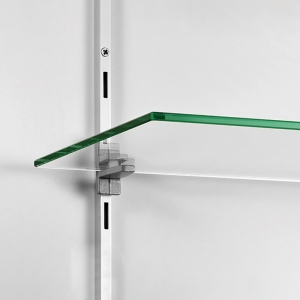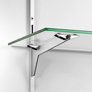 Afin de maintenir en place la tablette sur les consoles, utiliser les accessoires suivants :-Avec une tablette bois : utiliser les agrafes 2904 en position inclinée ou droite (0°).-Avec une tablette verre : utiliser les butées d'arrêt 2405 en position inclinée, ou les cavaliers acier à ventouses 4208-4209-4108 en position droite (0°).