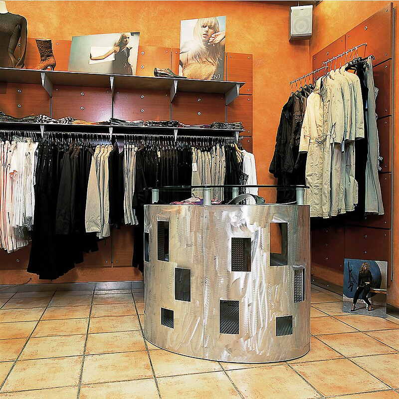 S'emboite dans une douille à fixation arrière ou façade.Bras perroquet avec 7 butées arrêt de cintres. L'inclinaison permet la présentation en facing de vêtements en décalé.