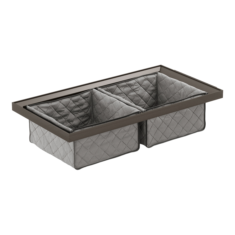 Les corbeilles sont fabriquées en tissu matelassé, finition gris Tasmanie, facilement détachables du cadre grâce aux fermetures velcro.