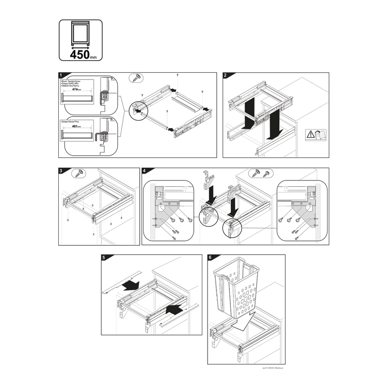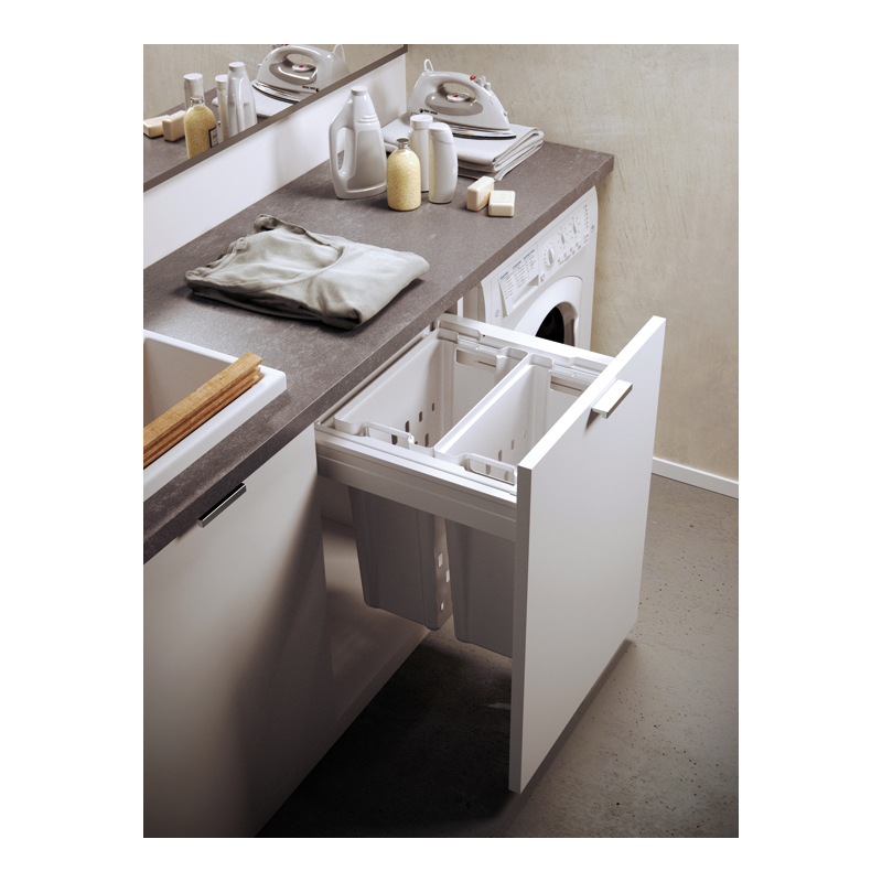 Corbeille à linge grande capacité avec bacs suspendus.Cadre en plastique, adaptable sur les profils tiroir ArciTech hauteur 94 mm, longueur 500 mm.Les profils tiroir ArciTech et les coulisses Actro sont à commander séparément.Pour caisson de 450 mm - 1 bac de 40 LPour caisson de 600 mm - 2 bacs de 20 L