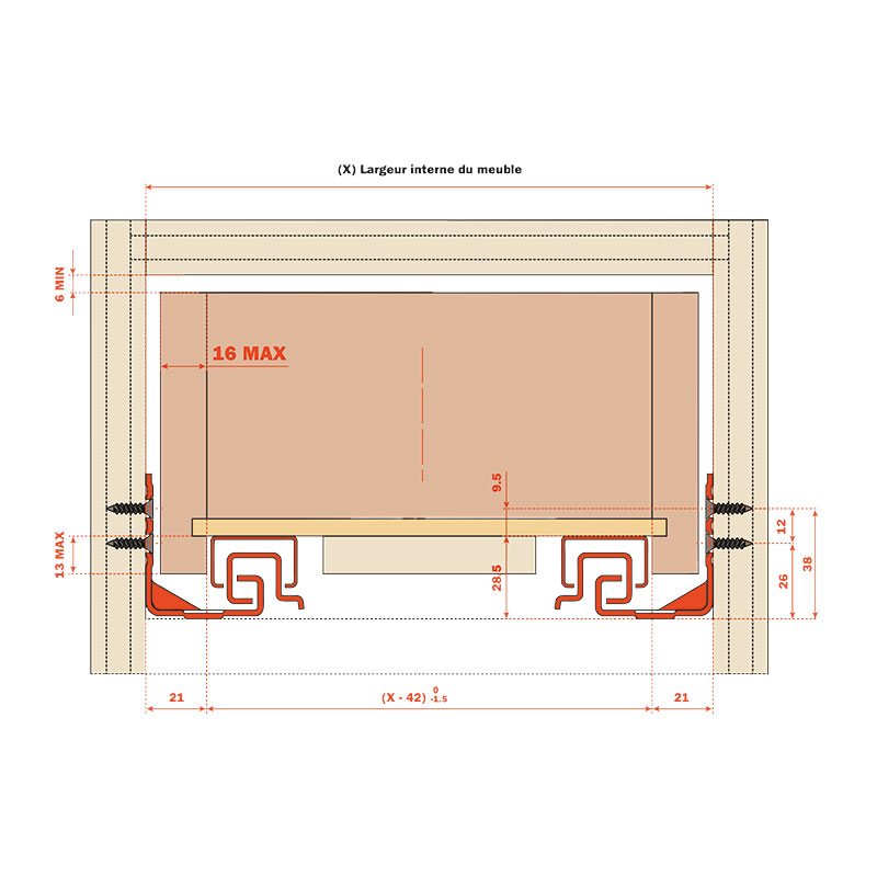 Coulisse sortie totale pour tiroirs avec côtés d'épaisseur de 13 mm à 16 mm.