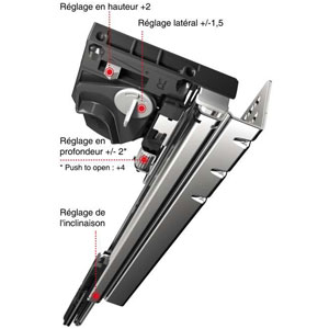 Coulisse invisible avec ouverture Push to Open.Il suffit d’exercer une légère pression pour ouvrir le tiroir.Le dispositif de blocage en position fermée empêche toute ouverture inopinée.4 réglages : Vertical, latéral, profondeur et inclinaisonRéglages sans outil.Ensemble comprenant :