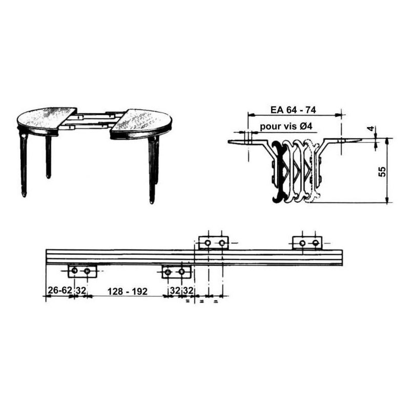 Coulisses de table en aluminium pour table à ouverture centrale. Coulisses en aluminium pour table à 4 pieds.