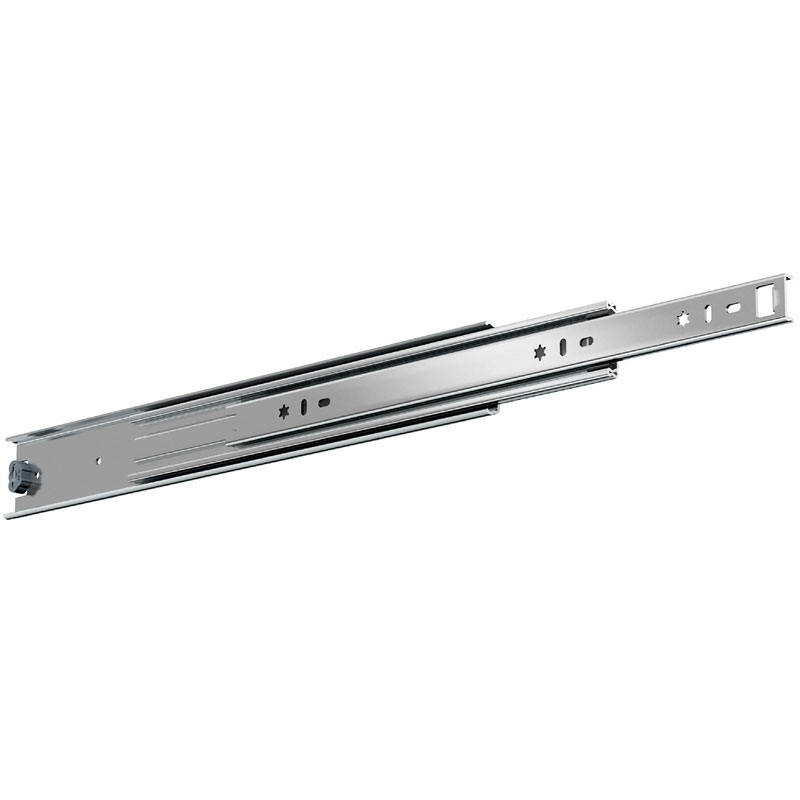 Coulisse à billes téléscopique - FR5052 : Schéma de perçage universel.Décrochage du tiroir en abaissant le levier situé dans la coulisse.Cran de positionnement garantissant le maintien en position fermée.