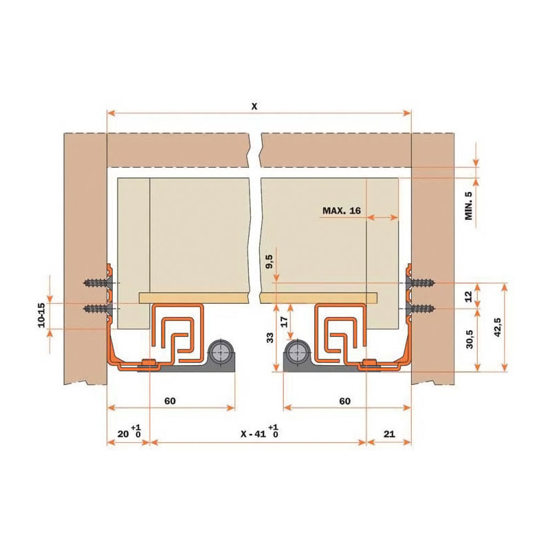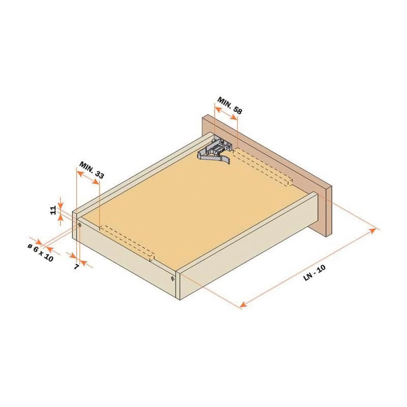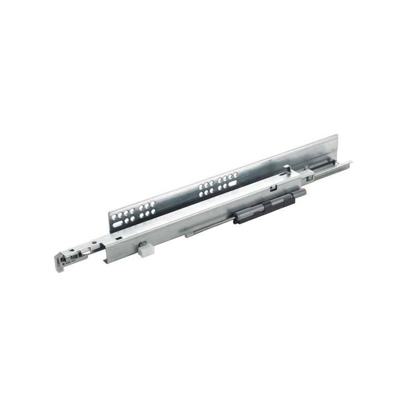Coulisse montée sur mécanisme inversé avec rappel en fin de course sur amortisseur permettant une ouverture automatique du tiroir par pression sur la façade et une fermeture traditionnelle en douceur.