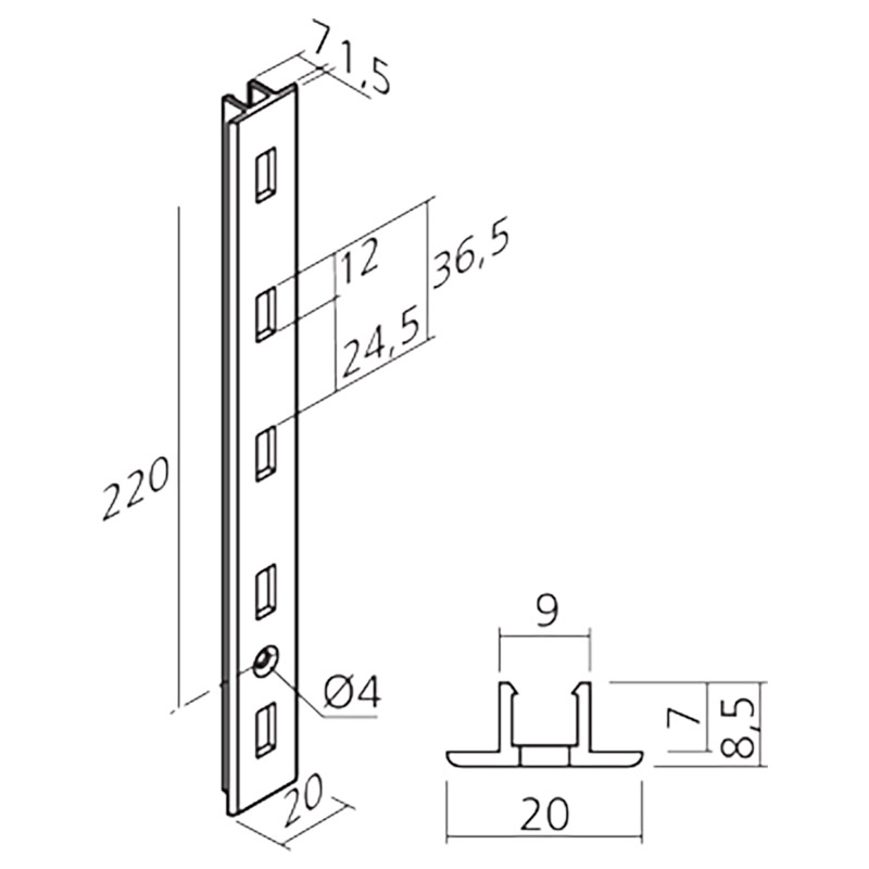 Crémaillère à recouvrement de section 20x8,5mm à perforation large de 5,5mm. Pas de 36,5mm.Fixation par vis Ø 4mm, avec entraxe 220mm.Pose encastrée dans une rainure ou entre deux panneaux.