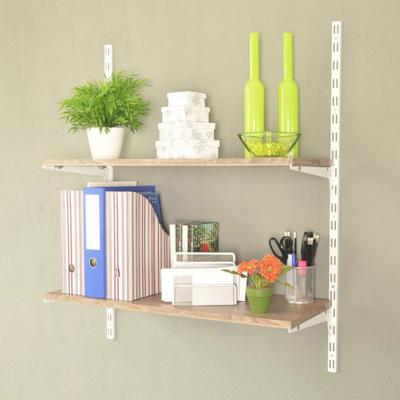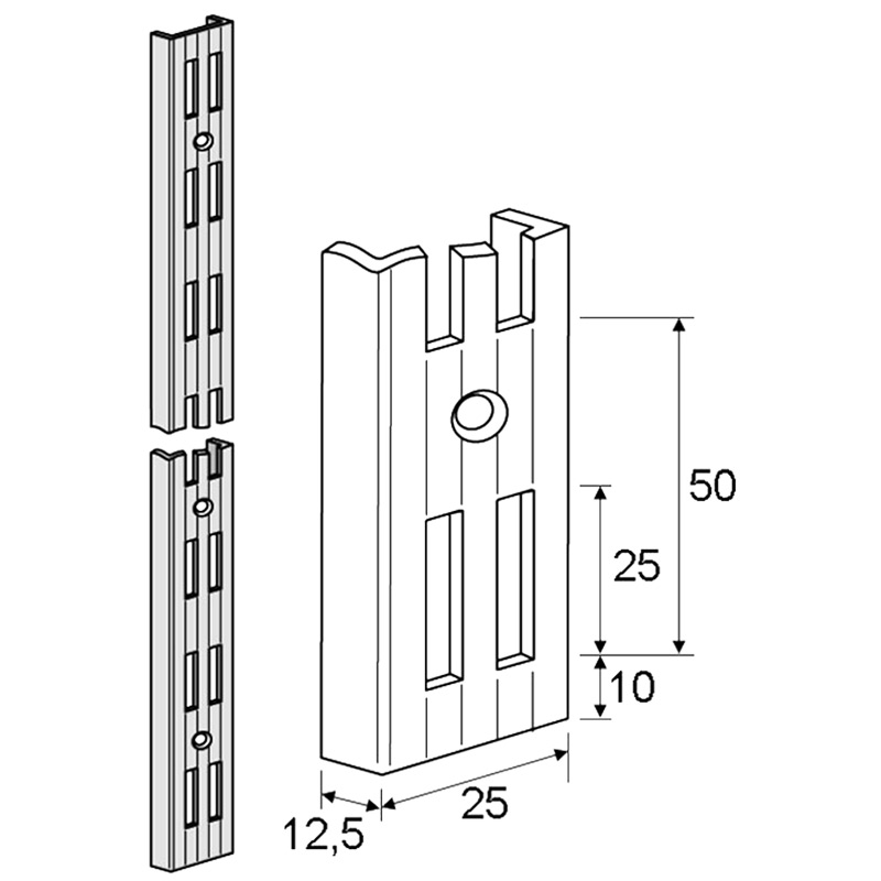 Crémaillère en acier laqué époxy, de section 25x12mm, avec perçage au pas de 50mm.Pose en applique.Fixation par vis et chevilles (non fournies).La double perforation permet de juxtaposer des tablettes sur un même niveau.